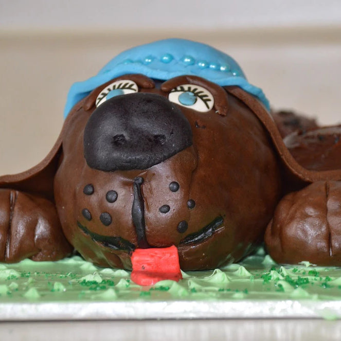 Scrumptious chocolatey cupcakes speckled in dark chocolate chips extend behind this blue-bonneted pooch. Available in regular and gluten-free!